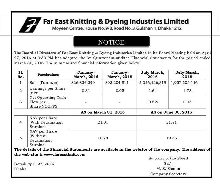 The Board of Directors of Far East Knitting & Dyeing Industries Limited in its Board Meeting held on April 27, 2016 at 3:30 PM has adopted the 3rd Quarter un-audited Financial Statements for the period ended March 31, 2016. The summarized financial information given below:
