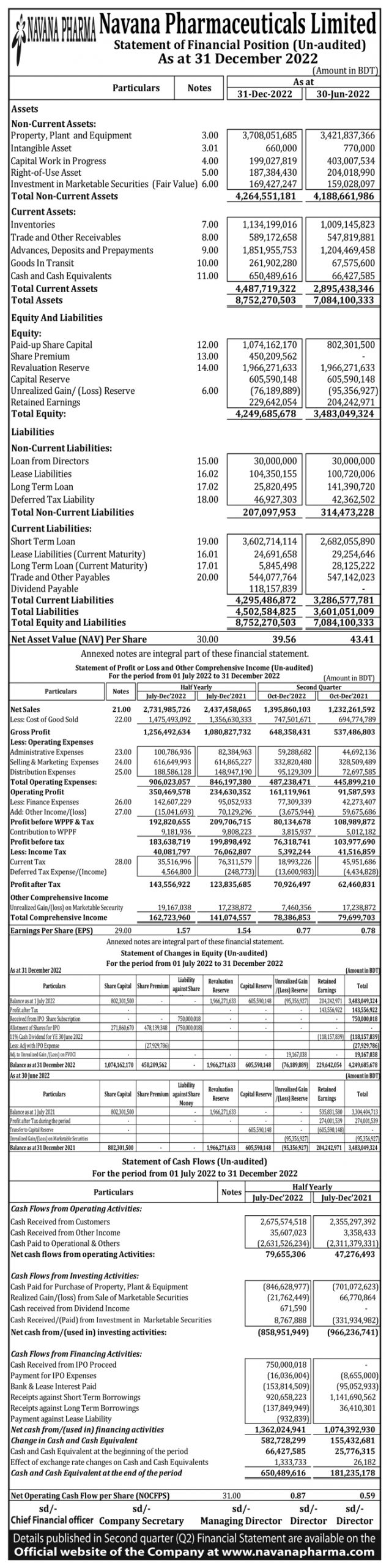 Statements of Financial Position of Navana Pharmaceuticals PLC.