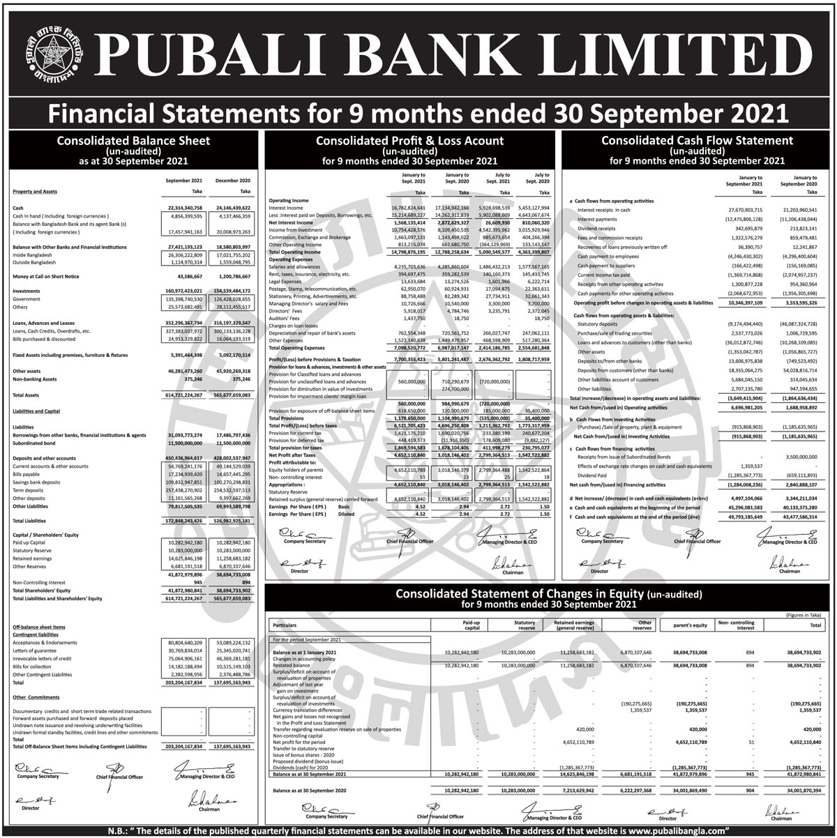 Q3 Financial Statements (Un-audited) of Pubali Bank PLC.