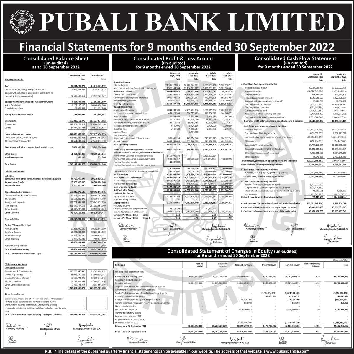 Q3 Financial Statements (Un-audited) of Pubali Bank PLC.