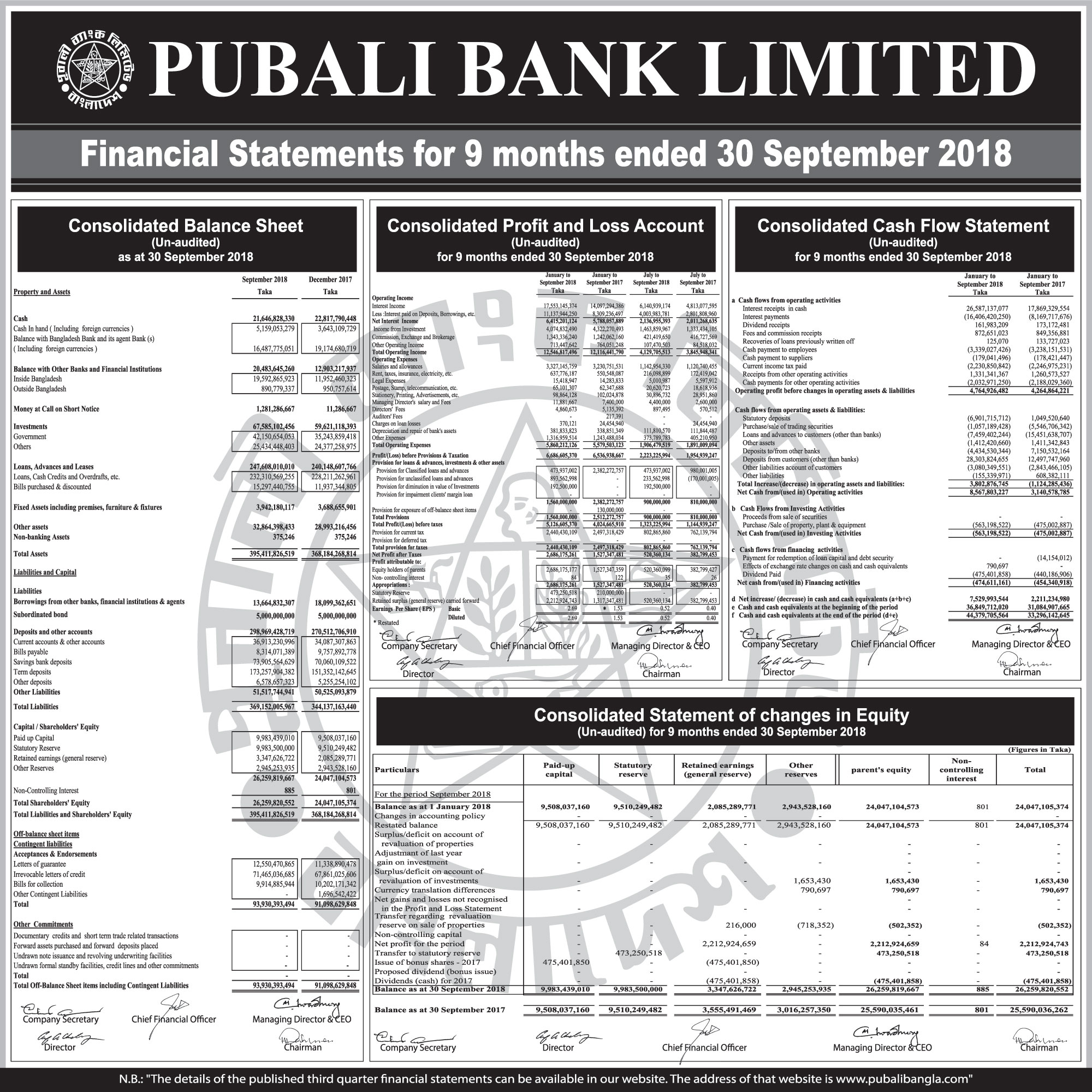 Q3 Financial Statements of Pubali Bank PLC
