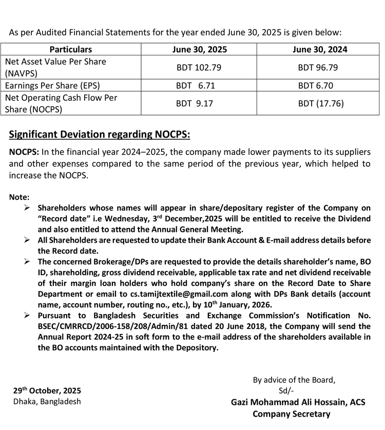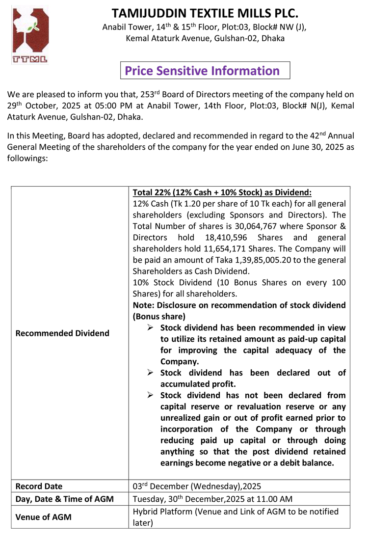 Price Sensitive Information of Tamijuddin Textile Mills Limited