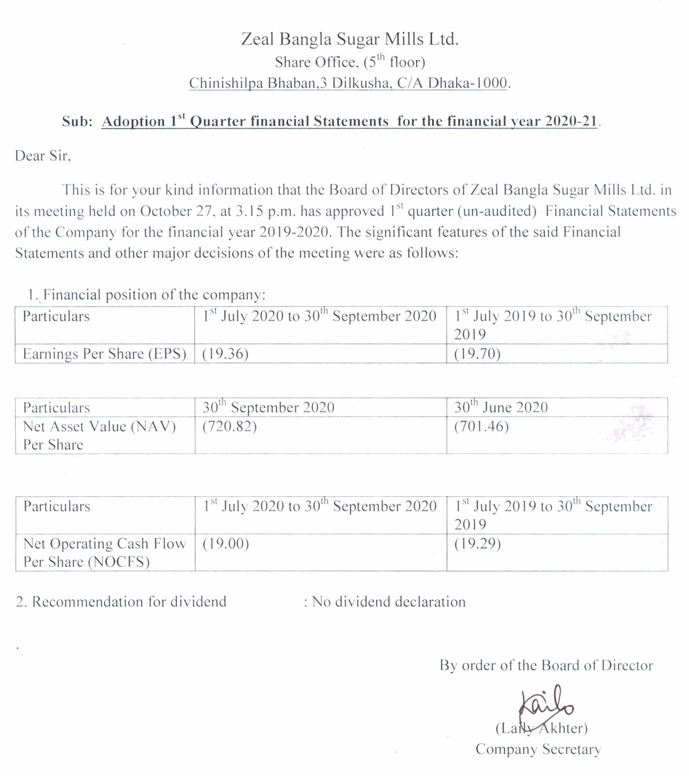 Q1 Financial Statements of Zeal Bangla Sugar Mills Ltd