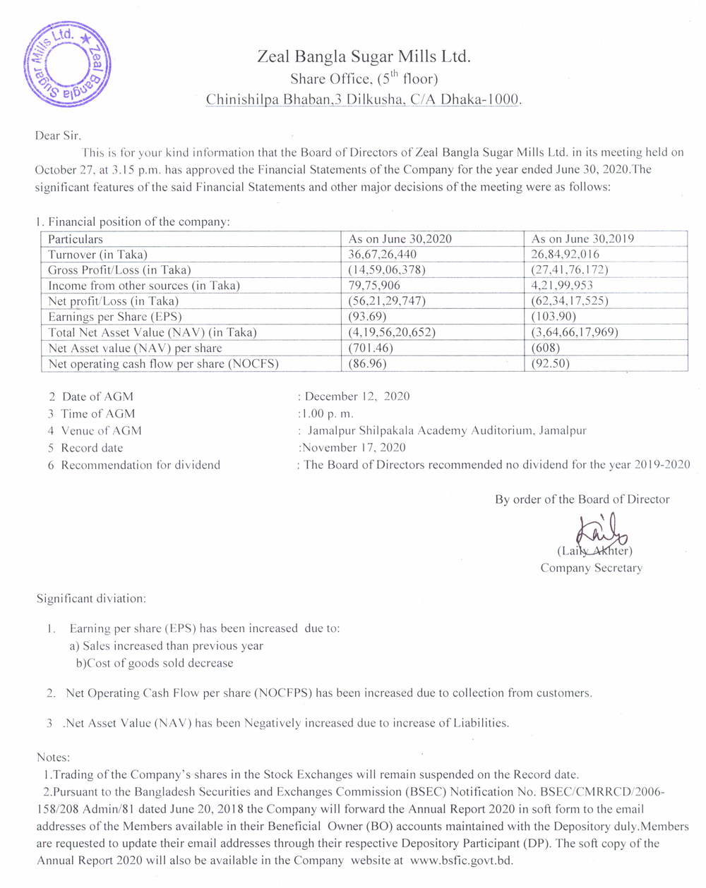 30th Annual General Meeting of Zeal Bangla Sugar Mills Ltd