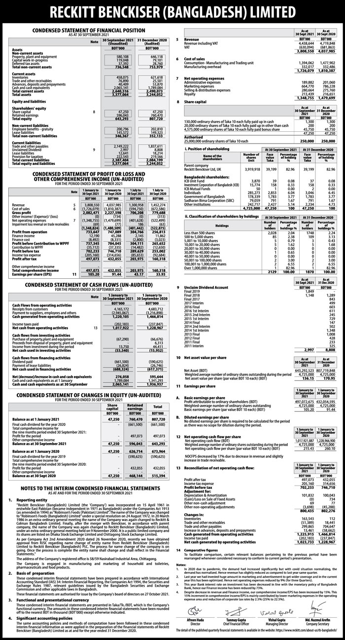 Financial Statements of Reckitt Benckiser(Bangladesh) PLC