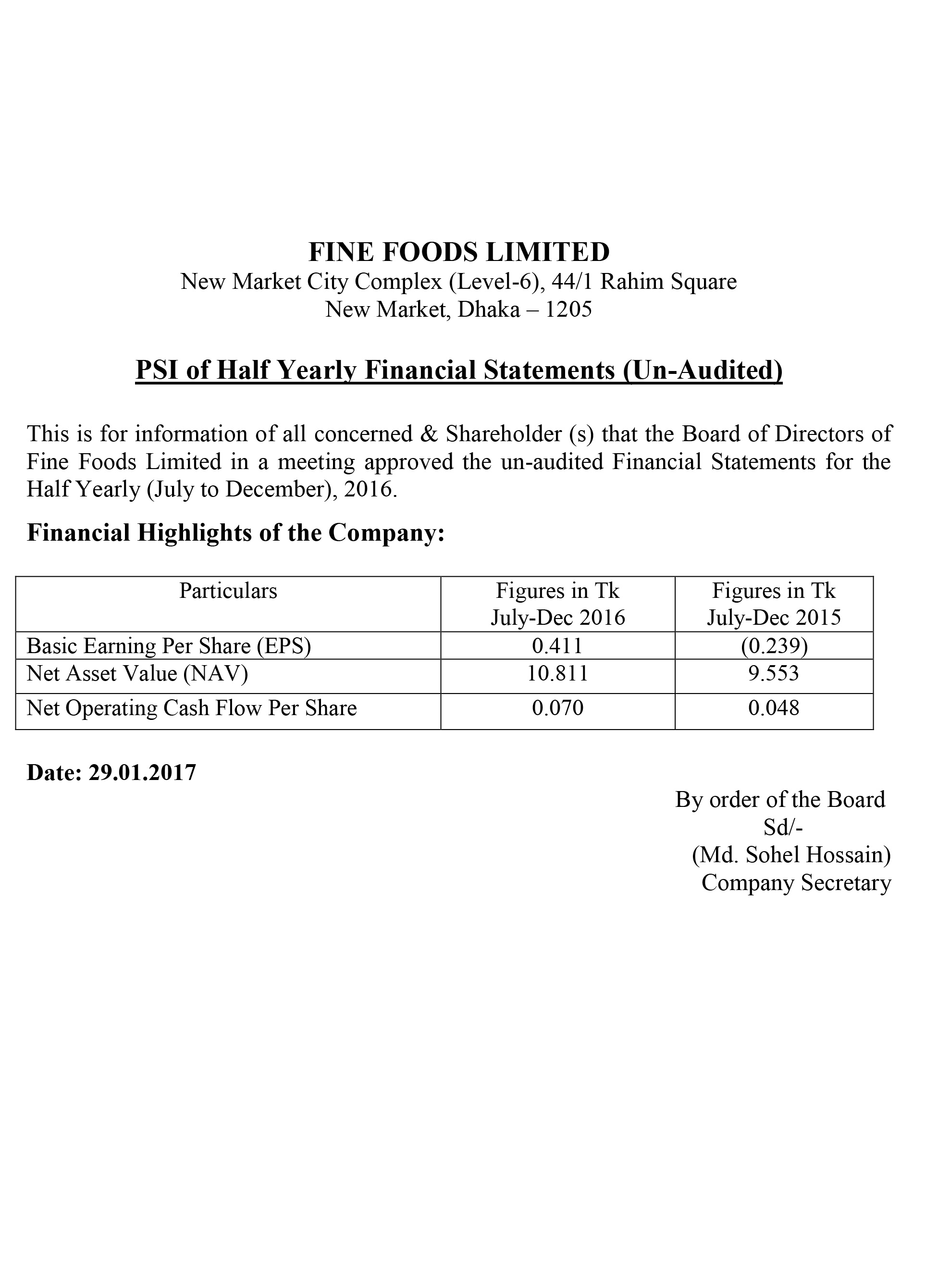 Price Sensitive Information (Q2) of Fine Foods Limited