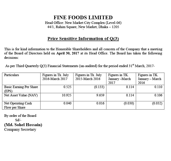 Price Sensitive Information (Q3) of Fine Foods Limited