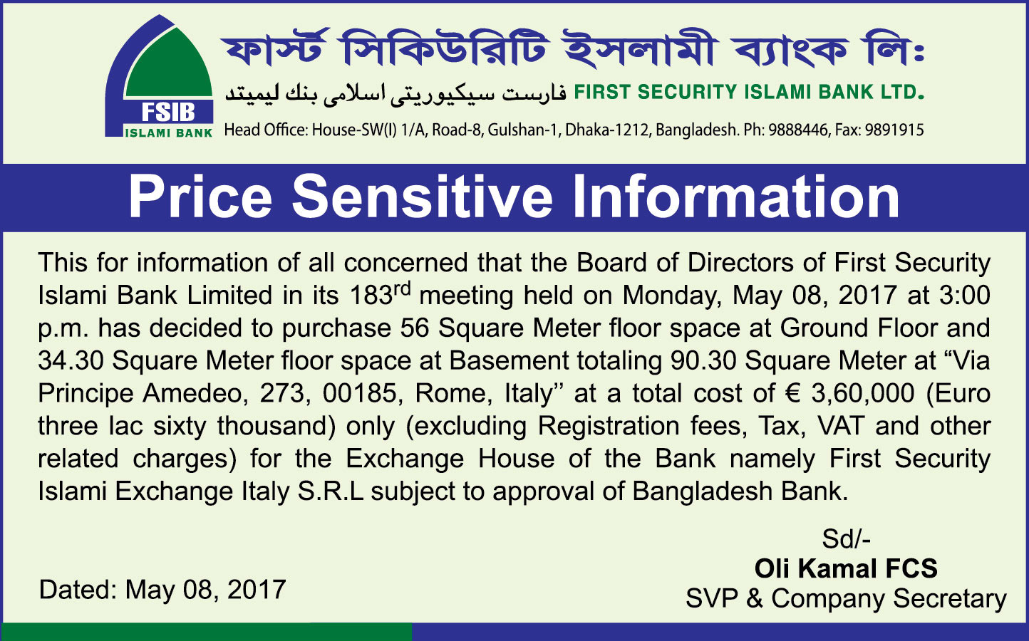 FIRST SECURITY ISLAMI BANK LIMITED PRICE SENSITIVE INFORMATION FOR ISSUANCE OF MUDARABA SUBORDINATED BOND