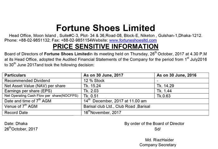 Price Sensitive Information of Fortune Shoes Ltd.