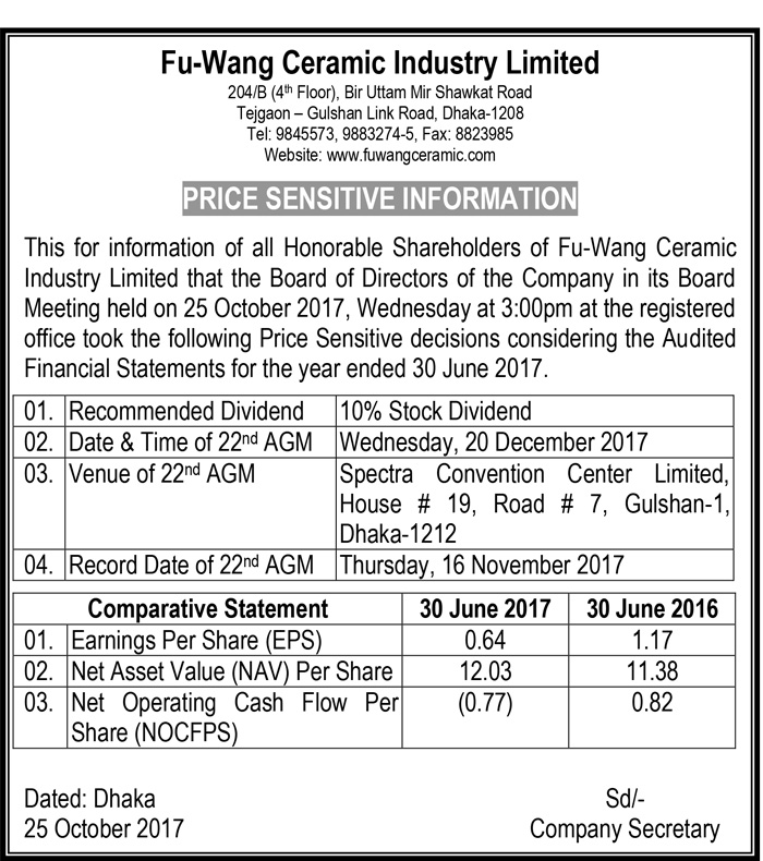 FU-WANG CERAMIC INDUSTRY LIMITED PRICE SENSITIVE INFORMATION