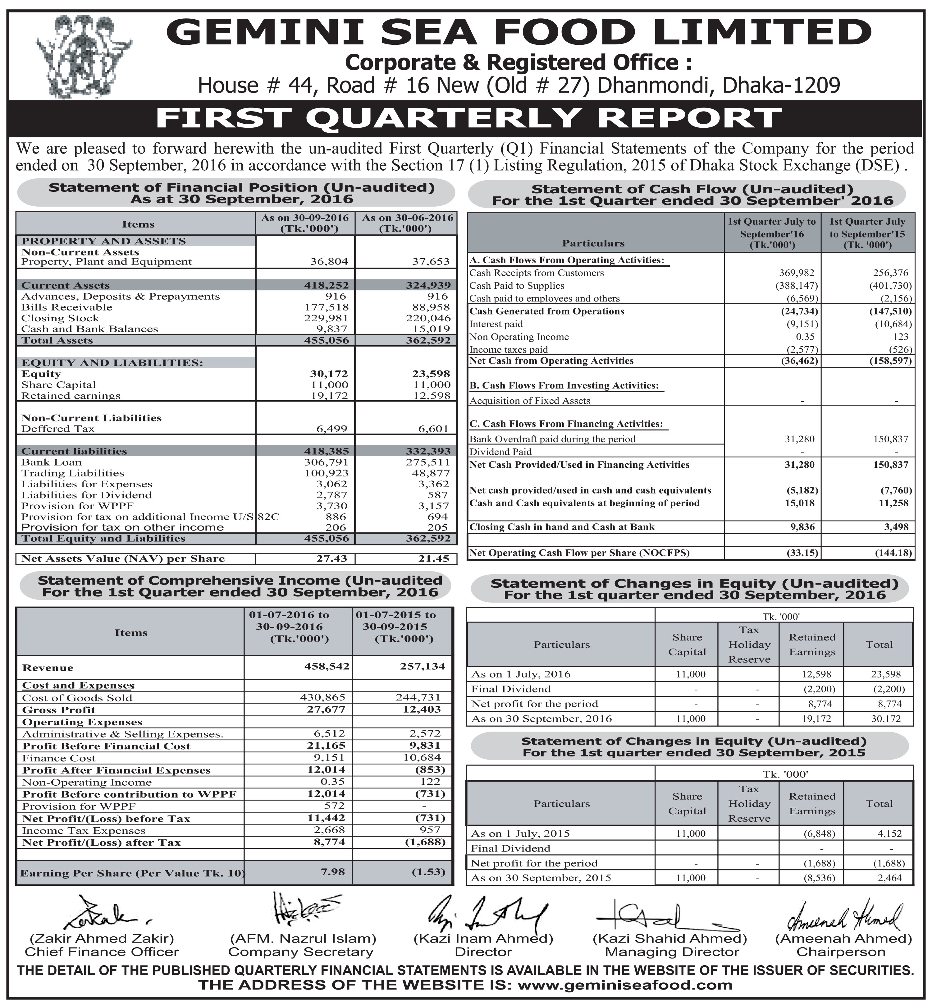 Gemini Sea Food Limited First Quarterly Report