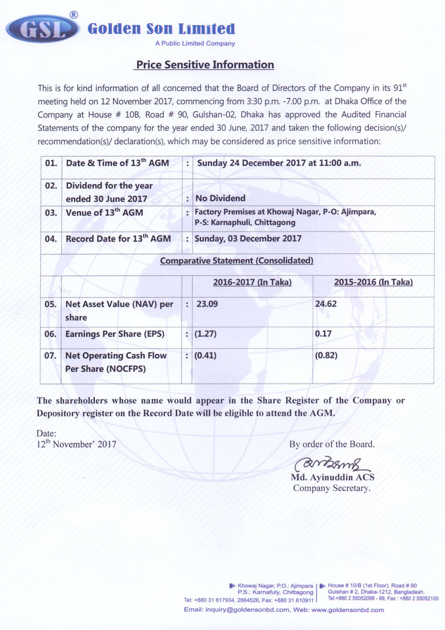 Price Sensitive Information of Golden Son Ltd
