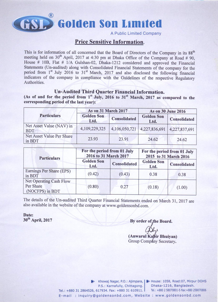 Price Sensitive Information of Golden Son Ltd.