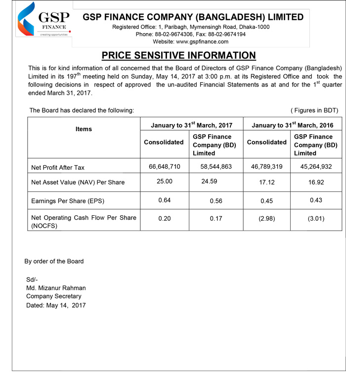 Price Sensitive Information of GSP Finance Company (Bangladesh) Limited