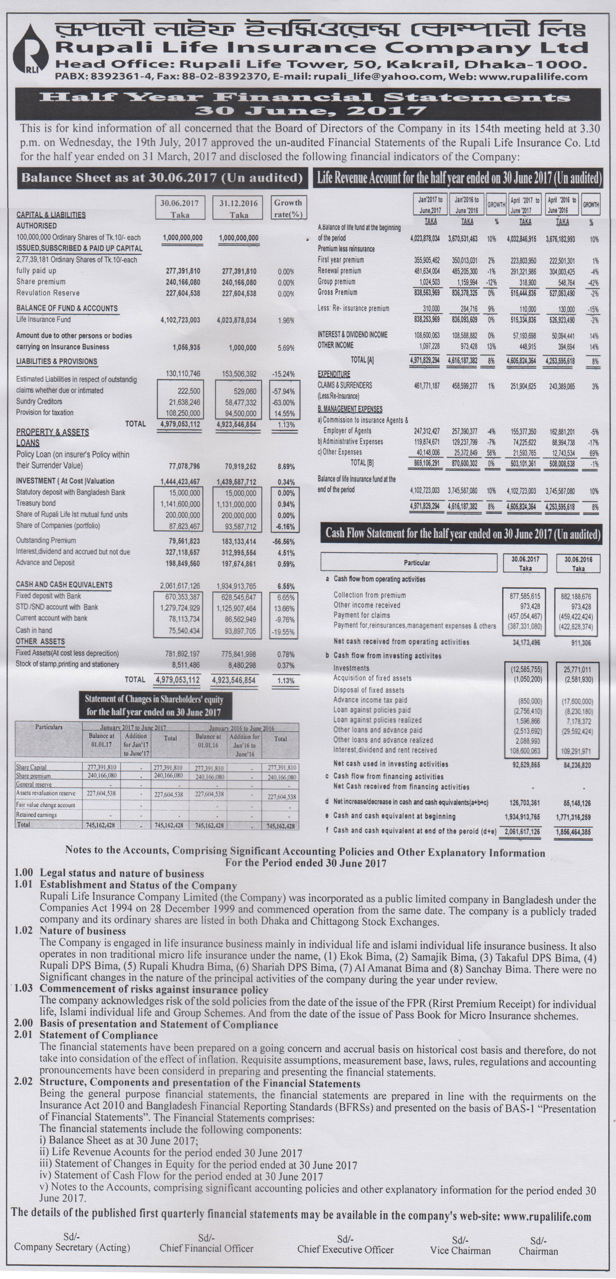 Half Year Financial Statements of Rupali Life Insurance Co. Ltd.
