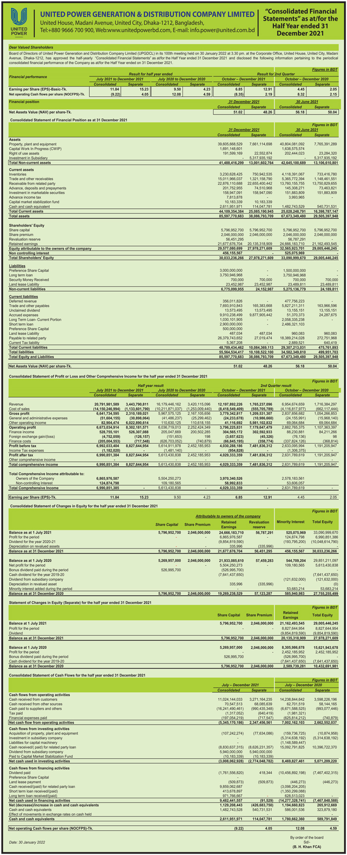 Half Yearly Consolidated Financial Statements of United Power Generation & Distribution Company Ltd