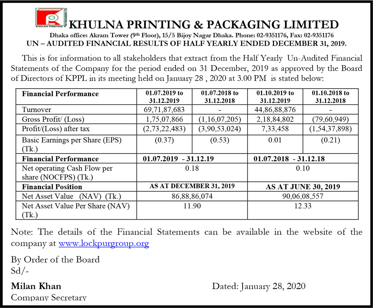 Un-audited Half Yearly Financial Results of Khulna Printing & Packaging Limited