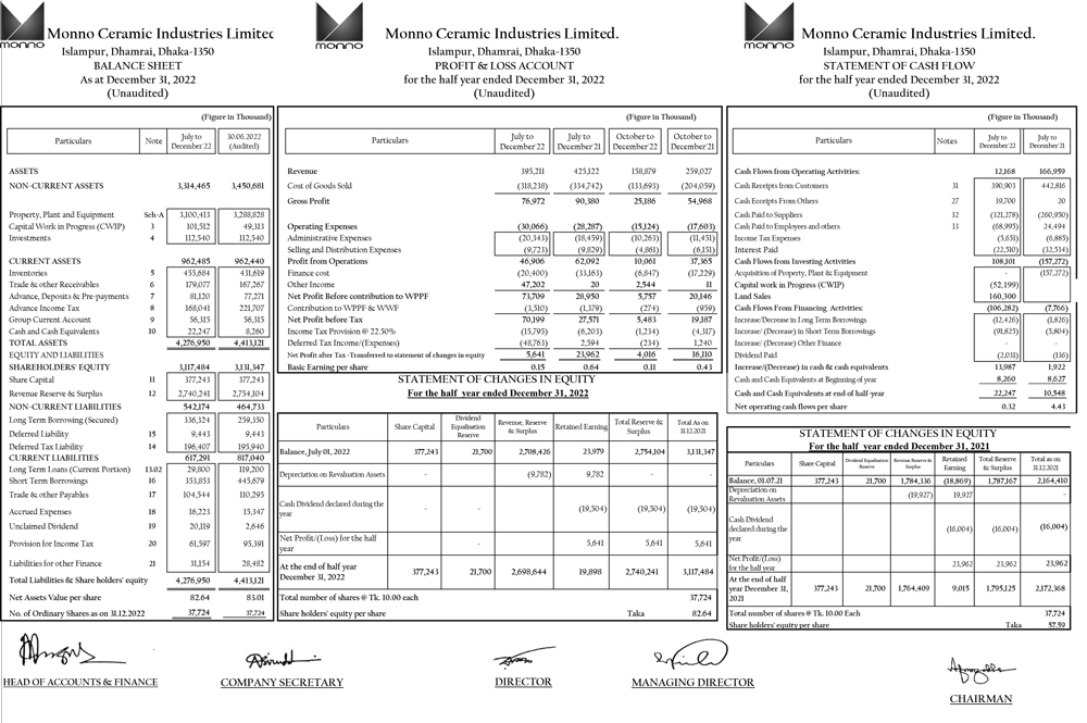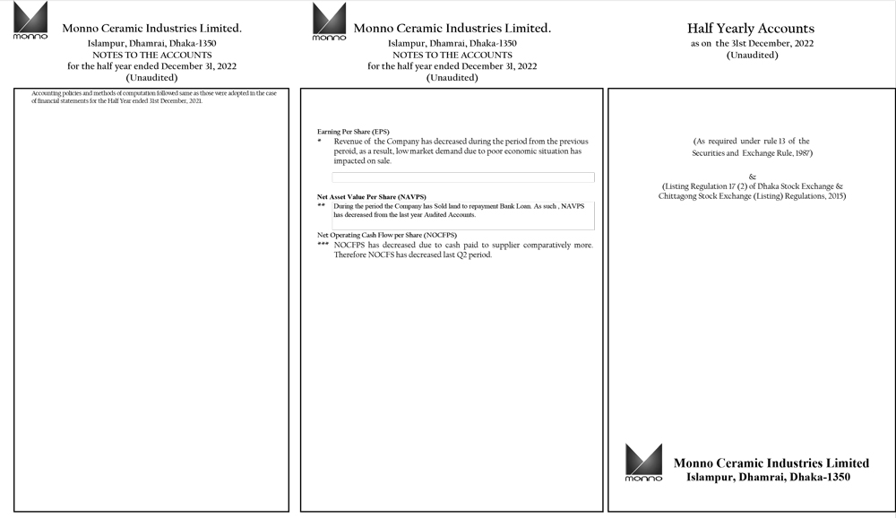 Half Yearly Financial Statement of Monno Ceramic