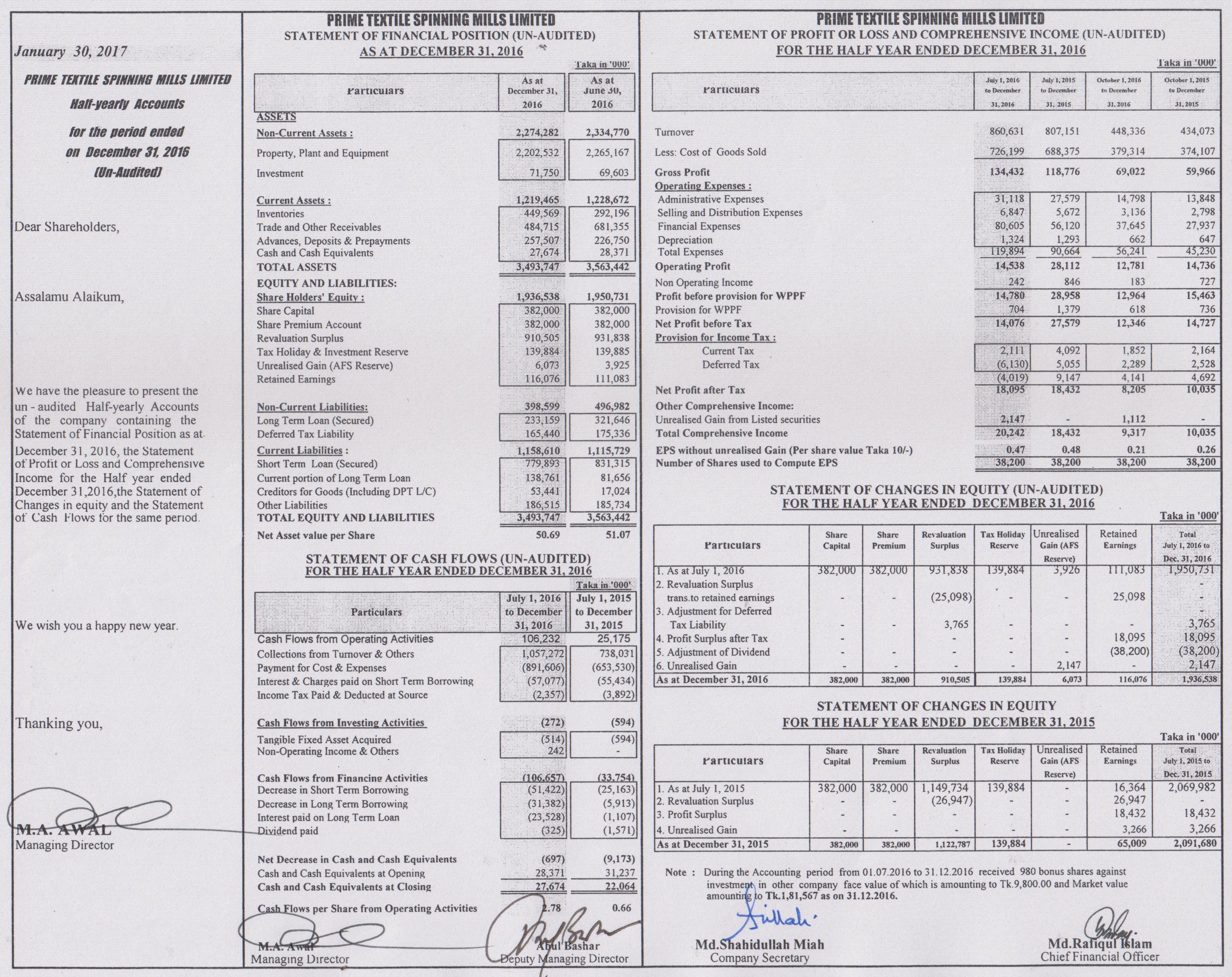 Half Yearly Financial Statement of Prime Textile Spinning Mills Limited
