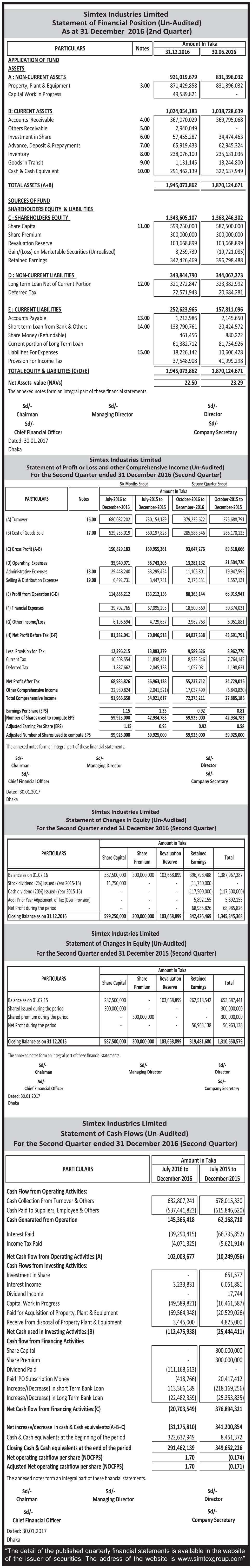 Q2 (Un-audited) Financial Statements of Simtex Industries Limited