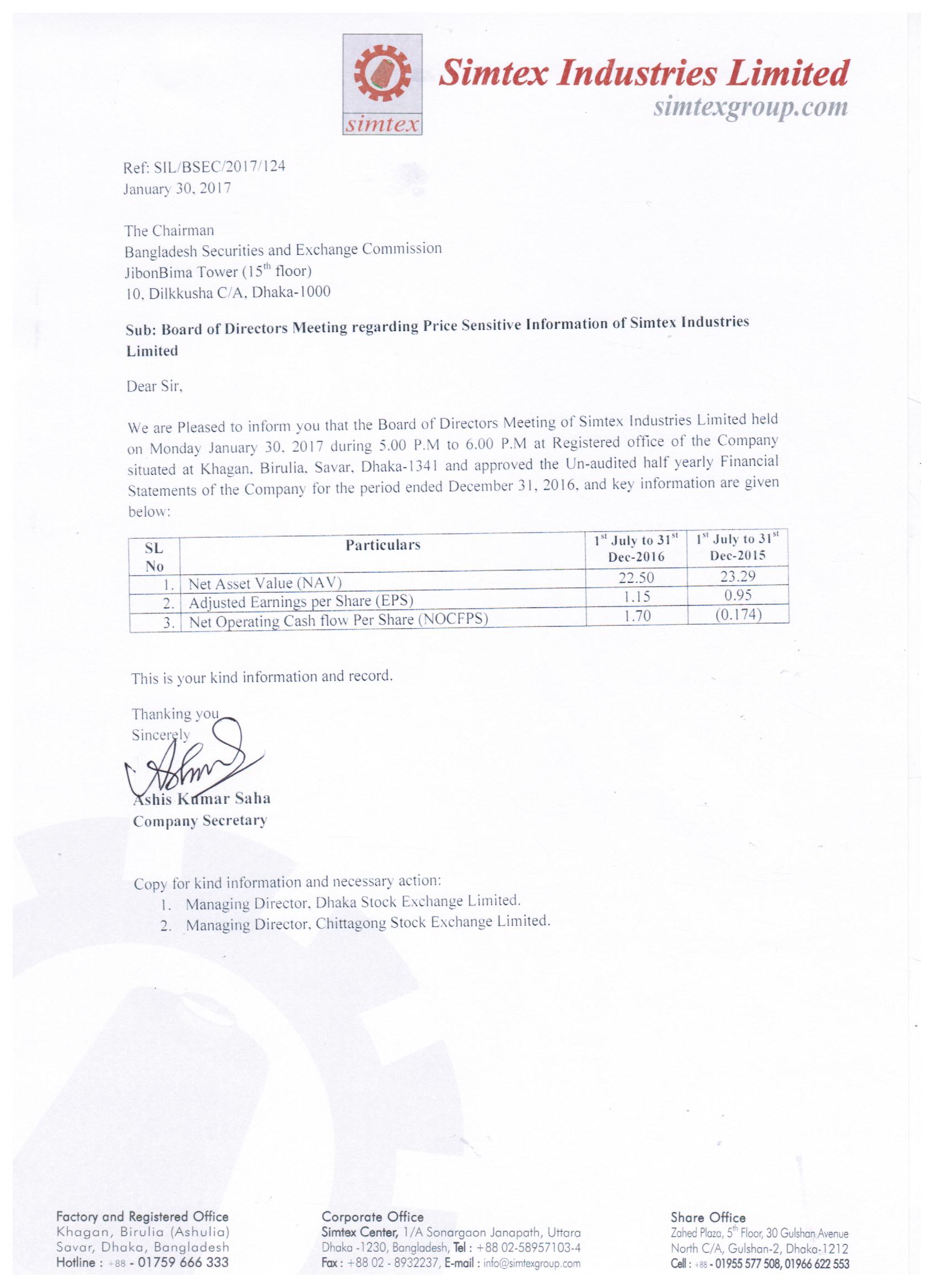 Price Sensitive Information of Simtex Industires Limited