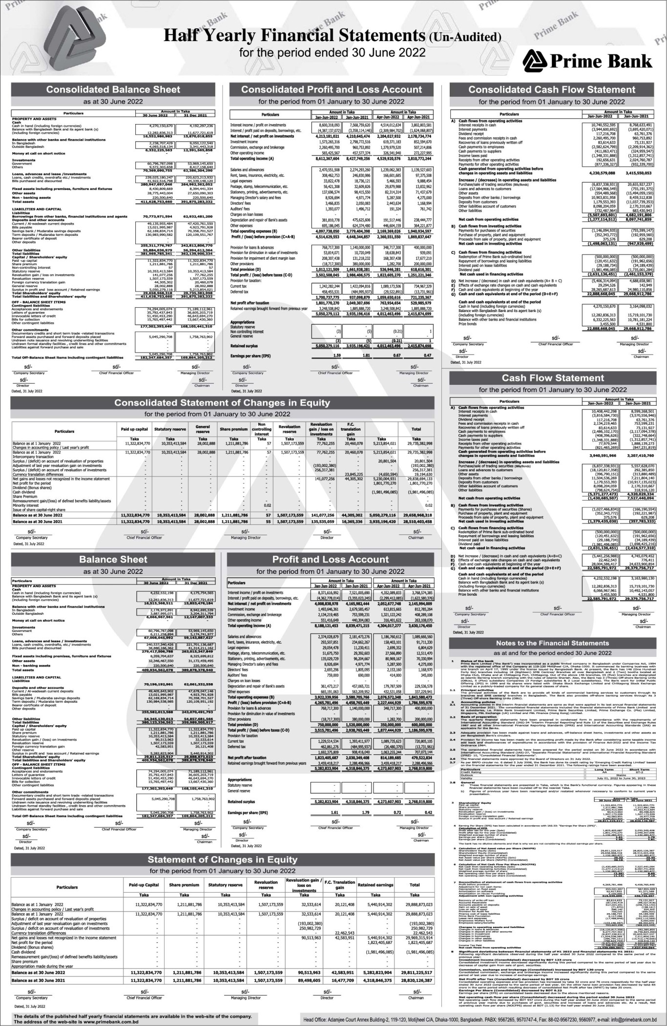 Half Yearly Financial Statement (Un-audited) of Prime Bank