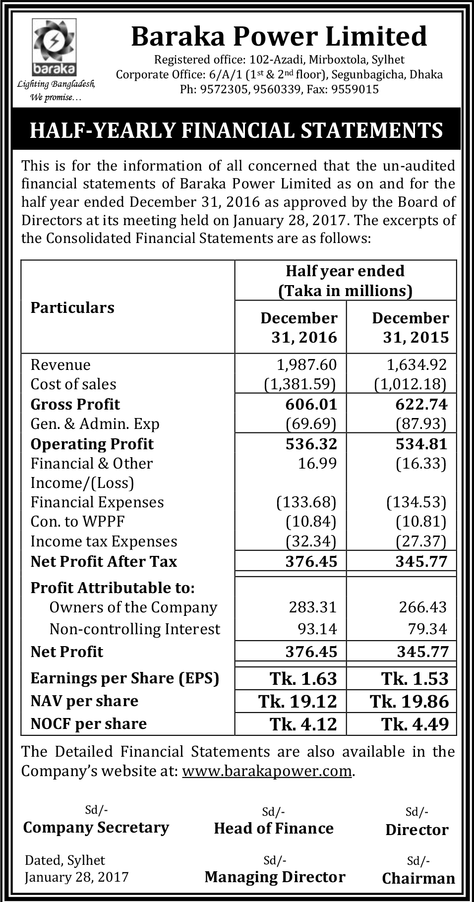 Notice to the Shareholders/Investors of Baraka Power Limited