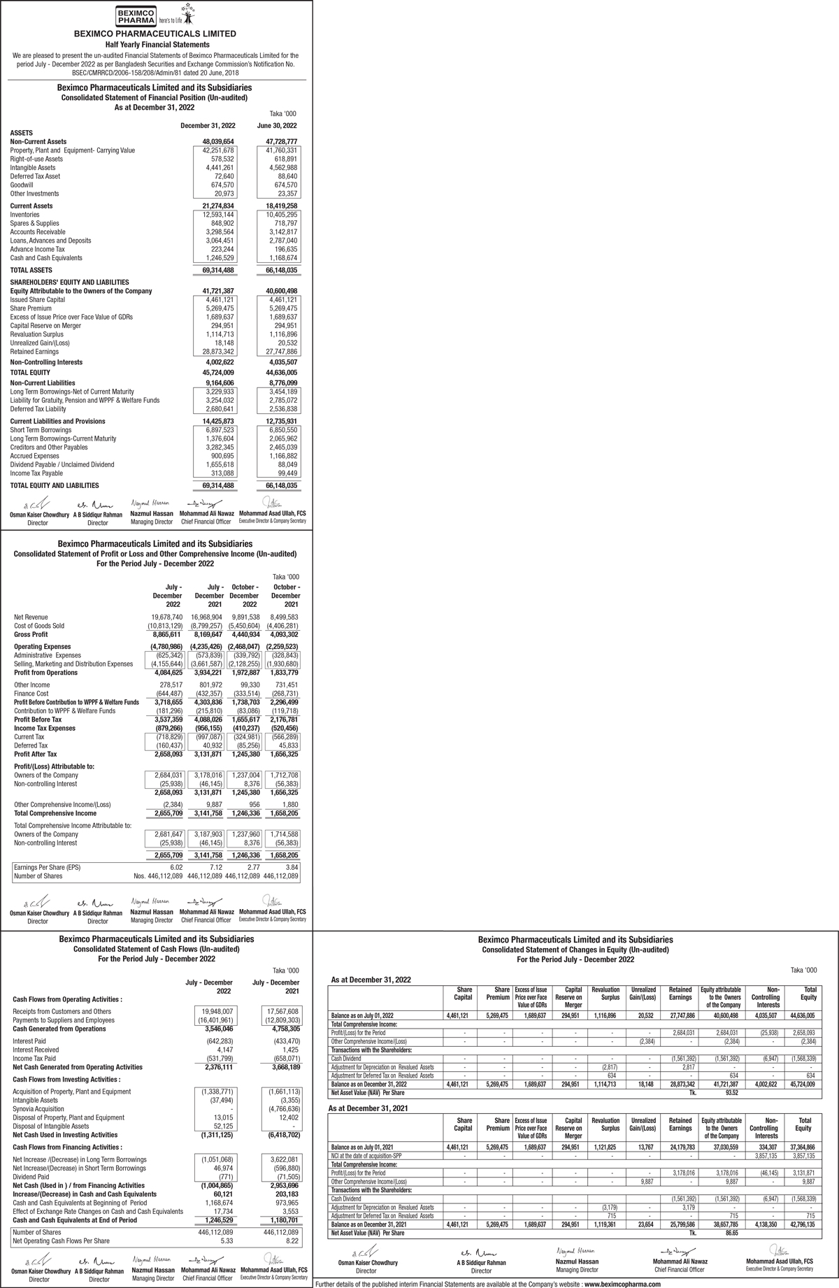 Half Yearly Financial Statements of Beximco Pharmaceuticals Ltd.
