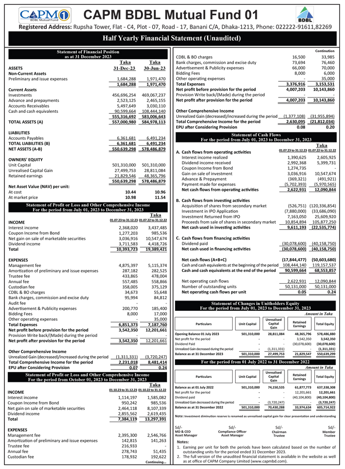 Half Yearly Financial Statements of CAPM BDBL Mutual Fund 01