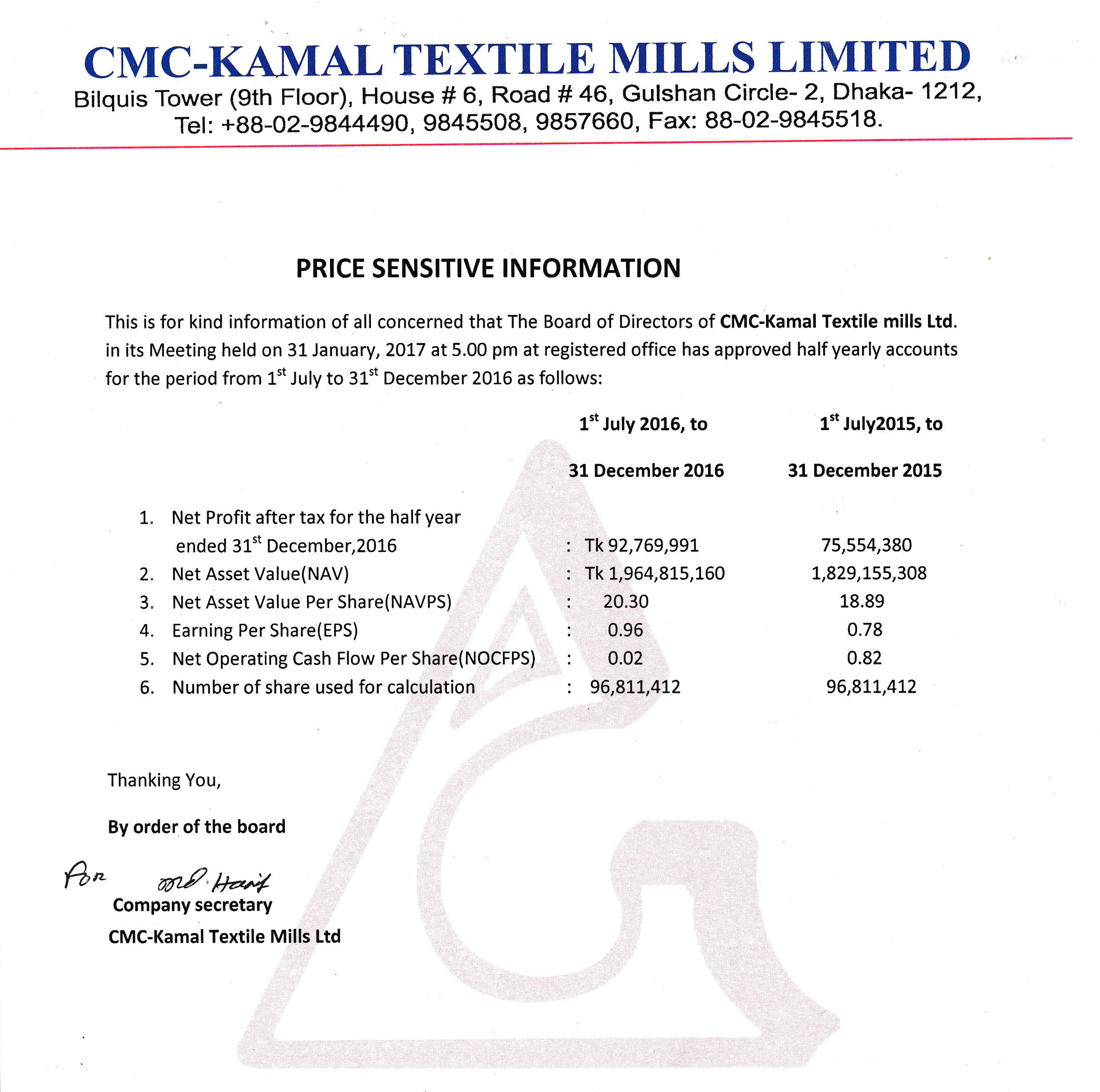 Price Sensitive Information of CMC-Kamal Textile Mills Ltd.