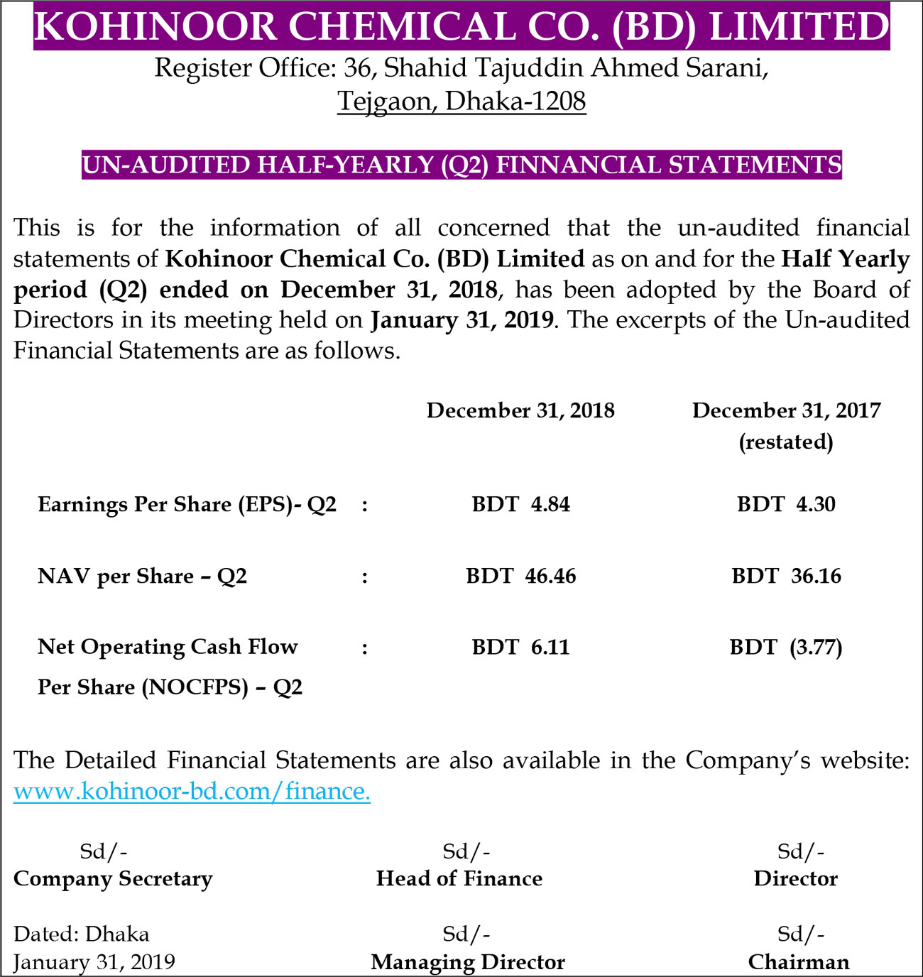 Q2 Un-audited Financial Statements of Kohinoor Chemical Company (Bangladesh) Limited