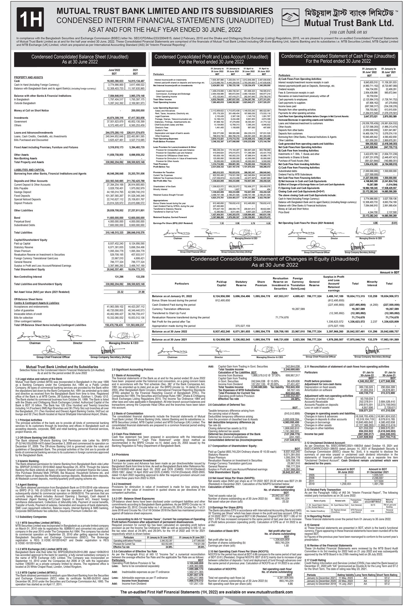 Half Yearly Financial Statements of Mutual Trust Bank Limited