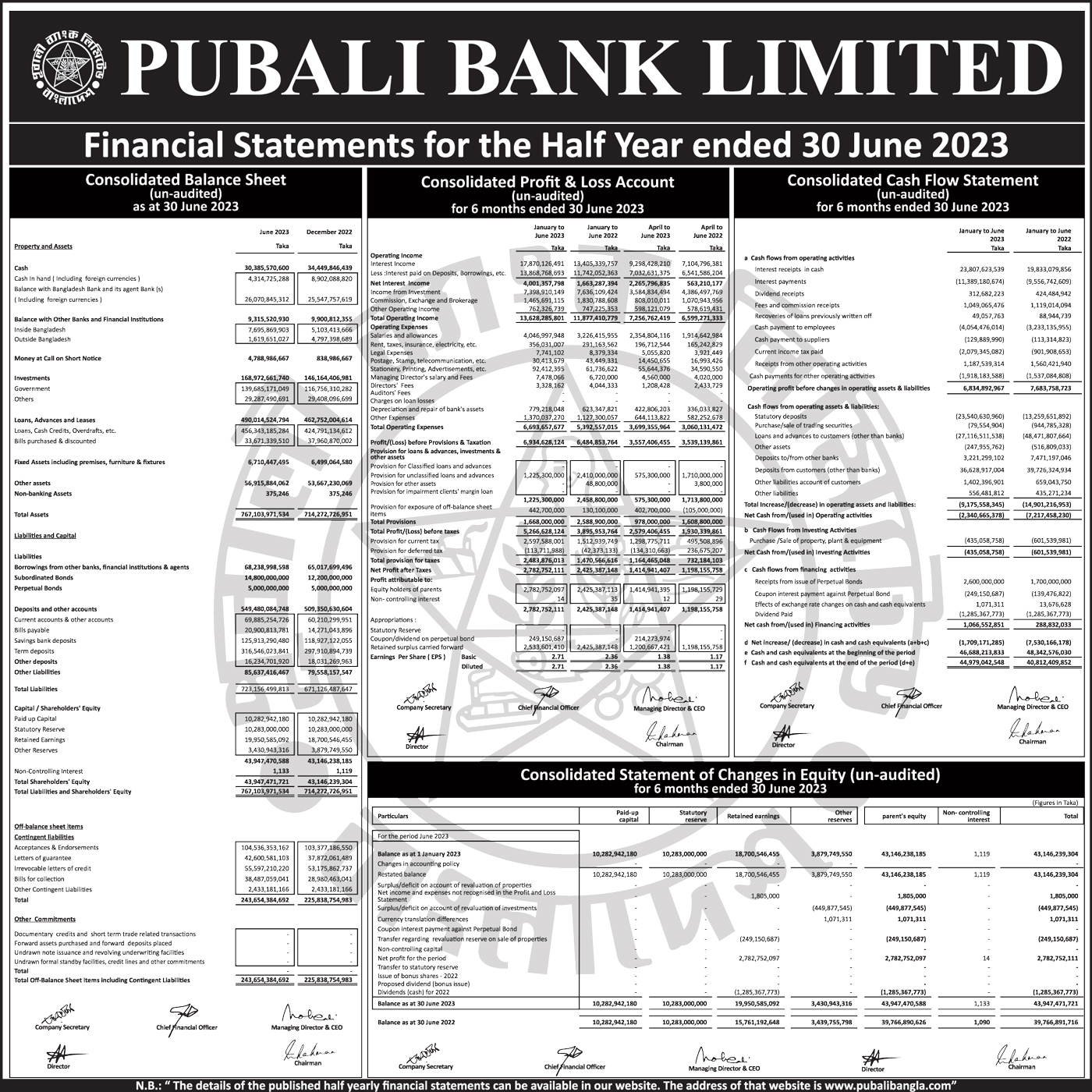 Half Yearly Financial Statements of Pubali Bank PLC.