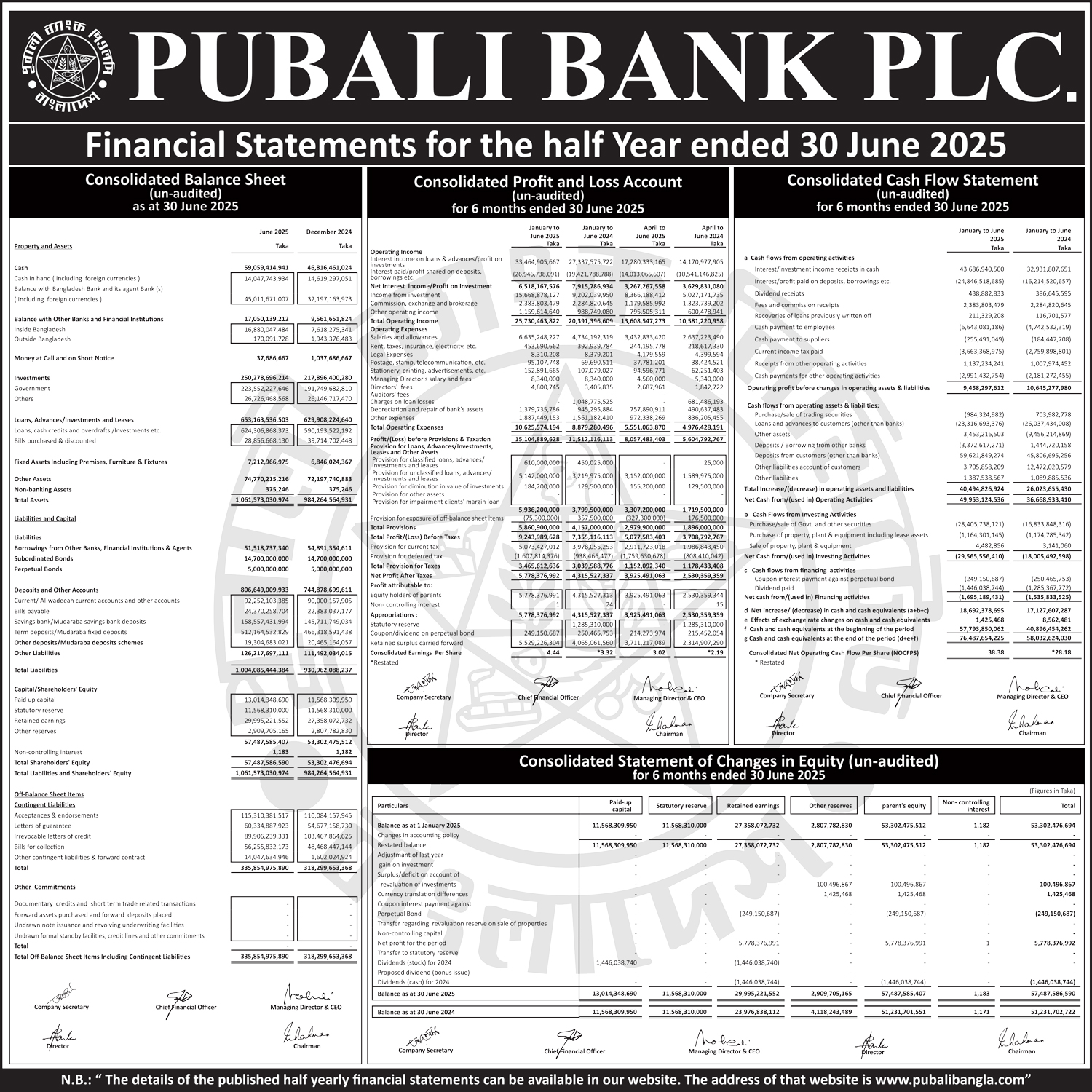 Half Yearly Financial Statements of Pubali Bank PLC