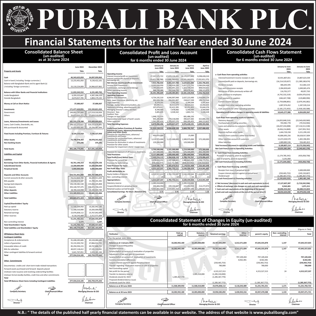 Half Yearly Financial Statements of Pubali Bank PLC