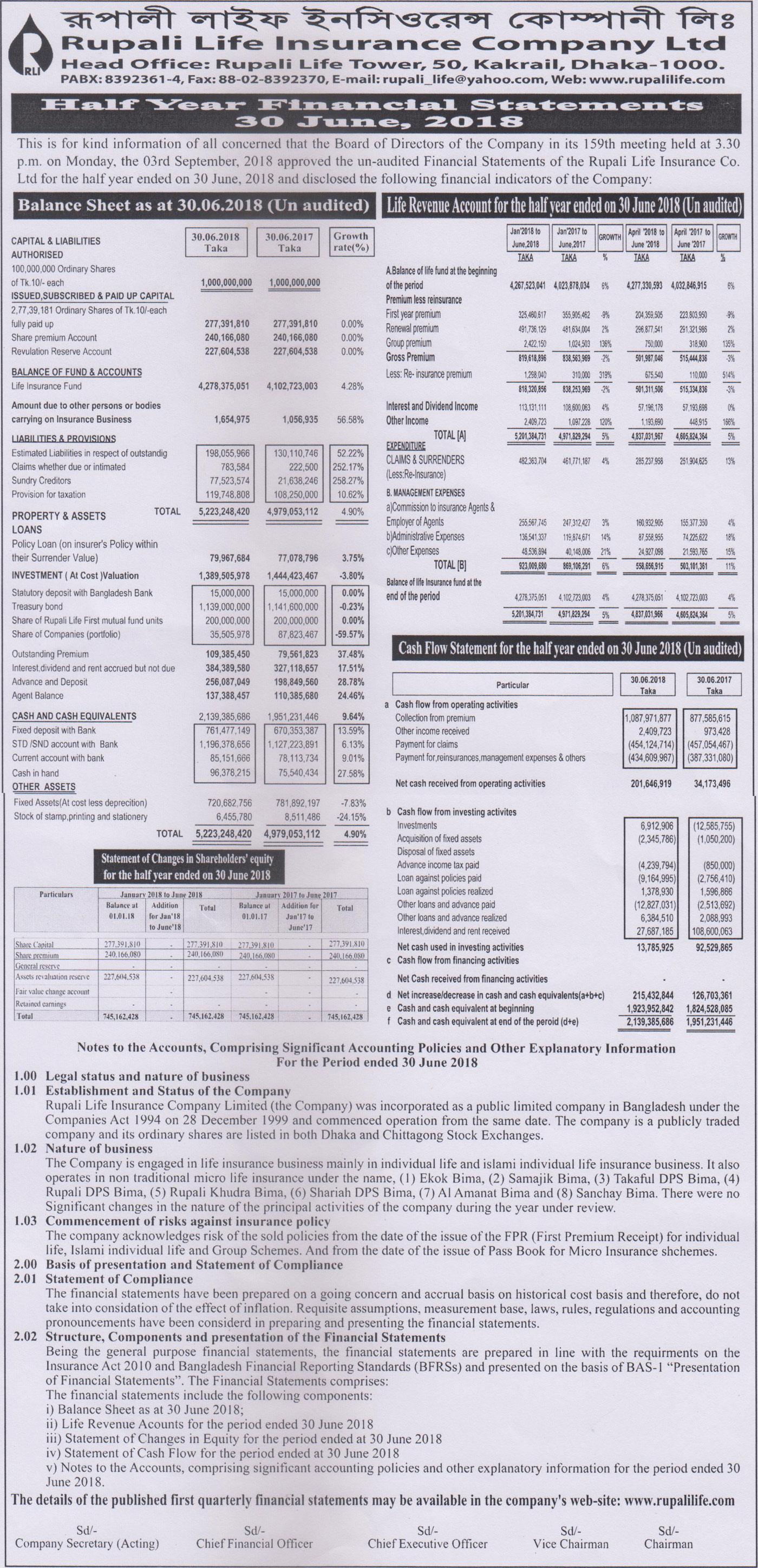 Half Year Financial Statements of Rupali Life Insurance Co. Ltd.