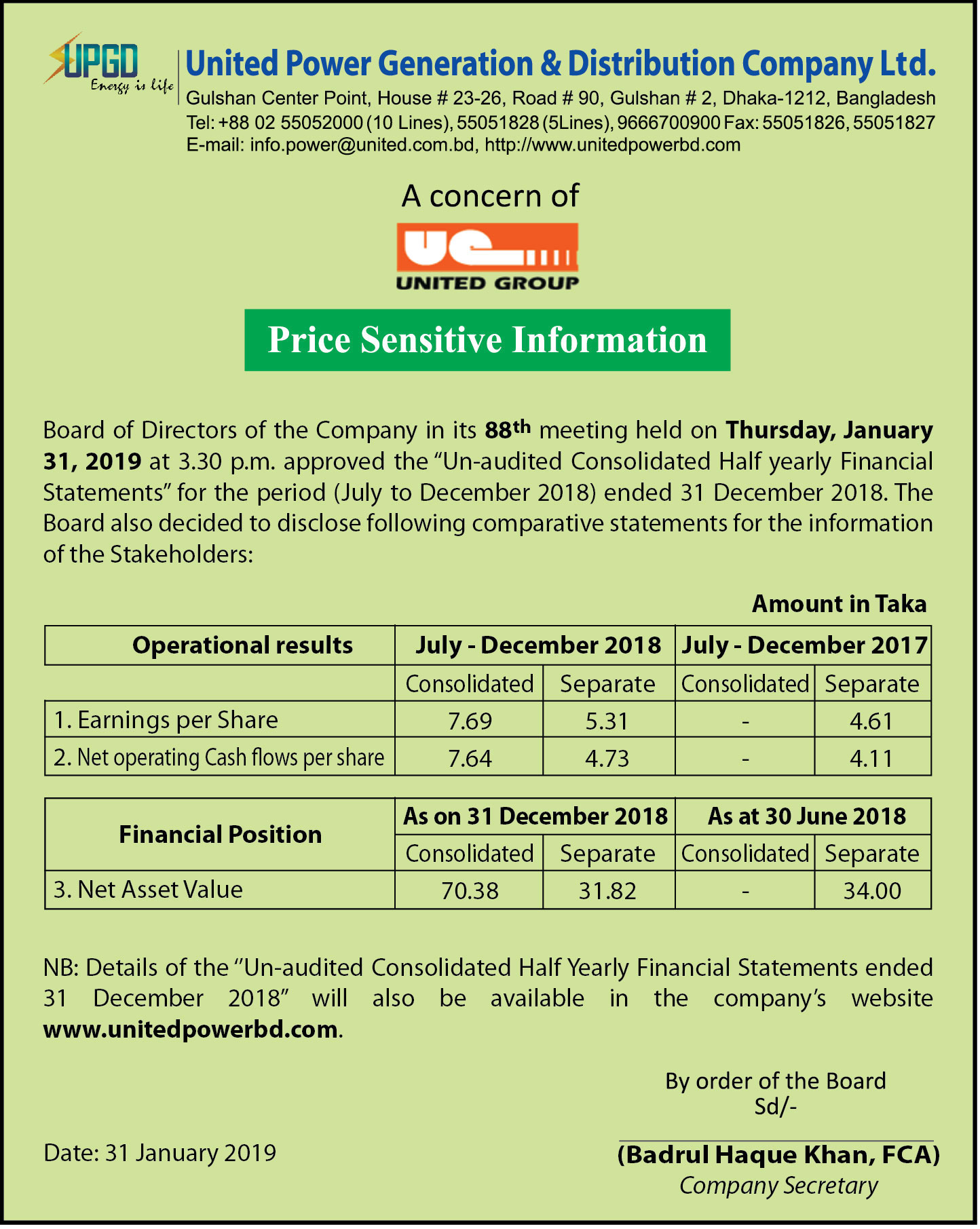 Price Sensitive Information of United Power Generation & Distribution Company Ltd