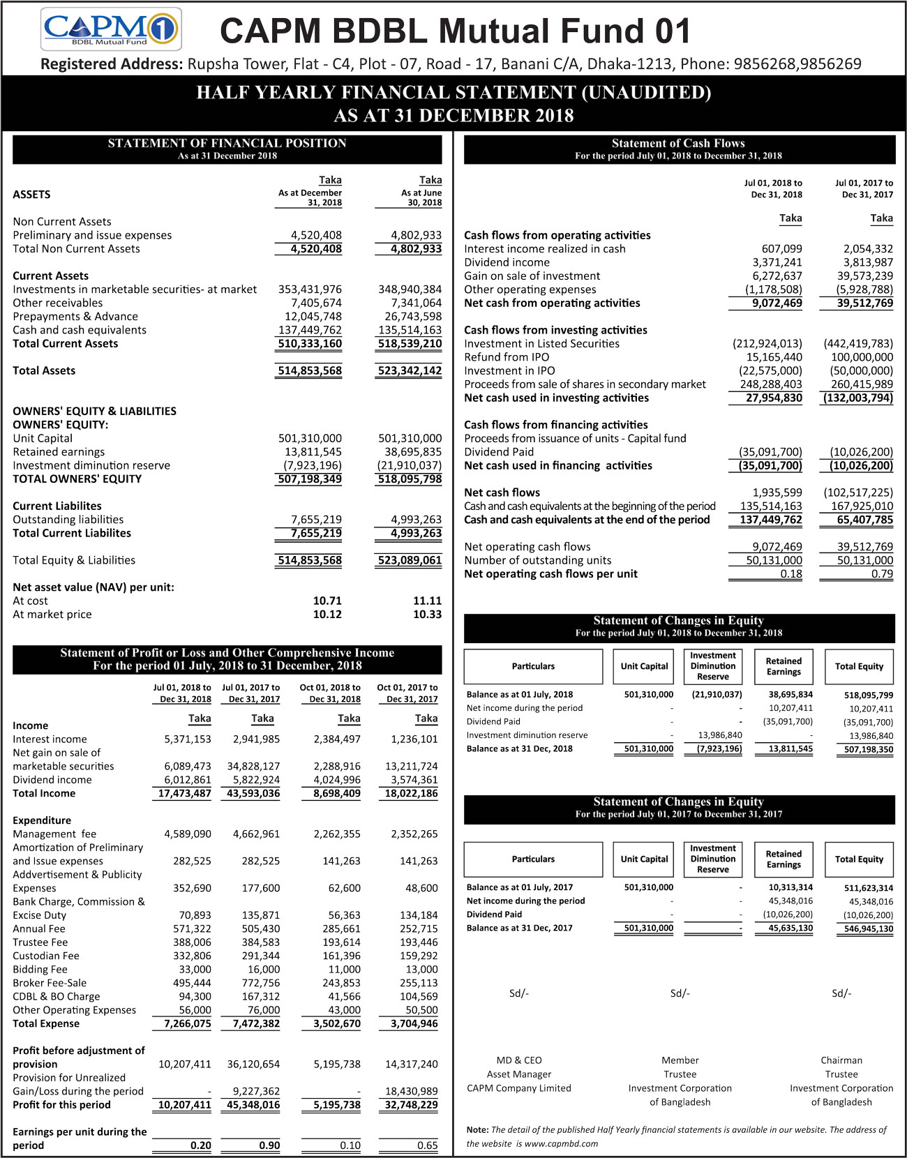 Half Yearly Financial Statements of CAPM BDBL Mutual Fund 01