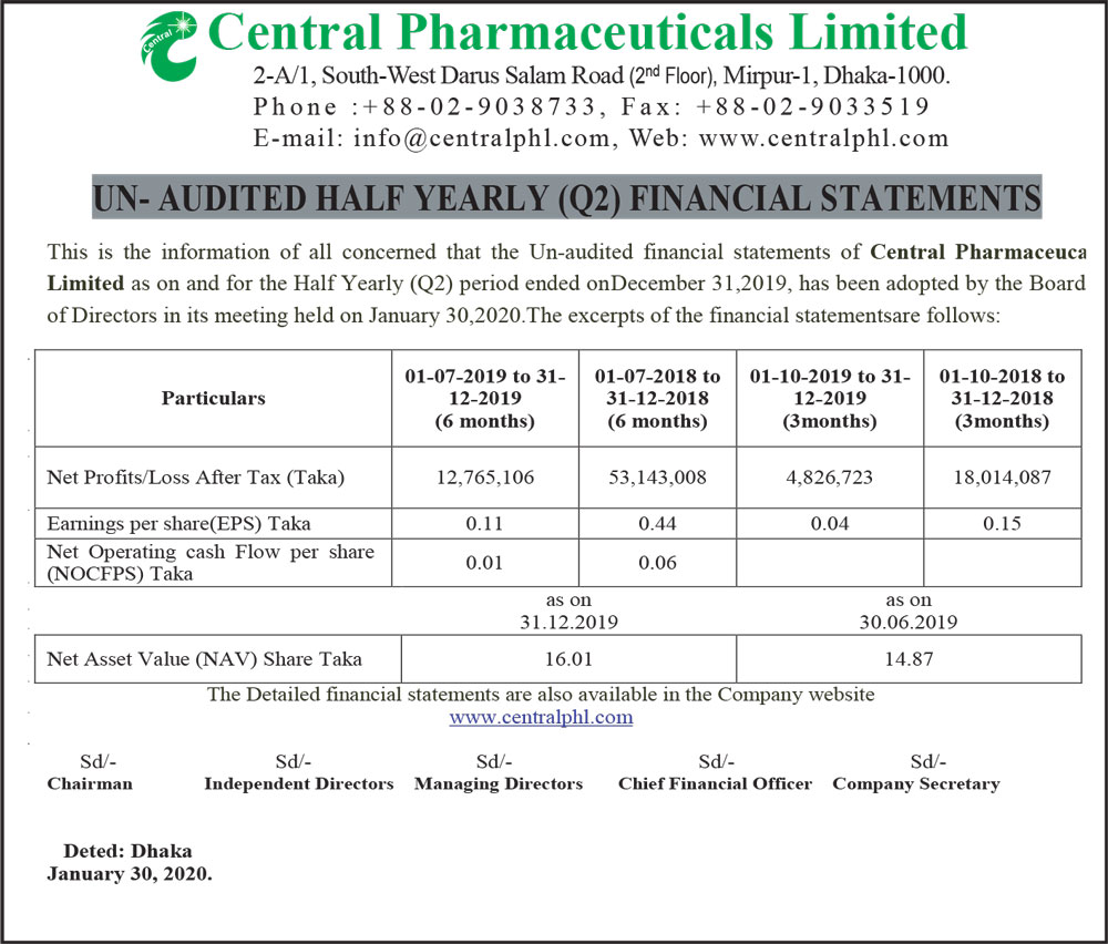 Half Yearly (Un-audited) Financial Statements of Central Pharmaceuticals Limited