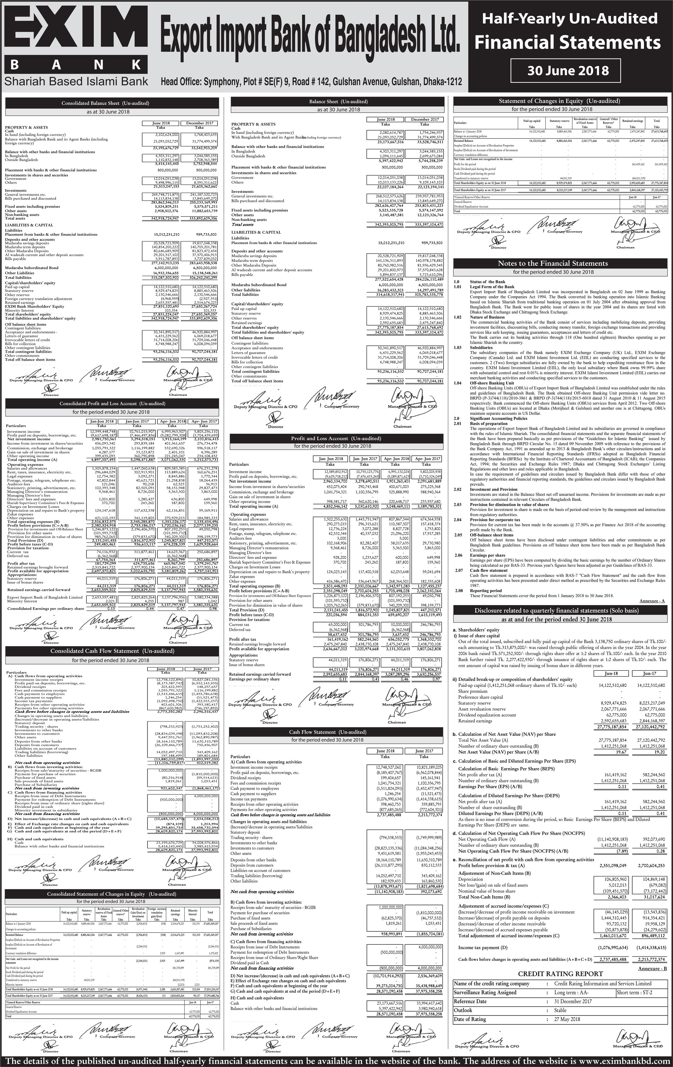 Half Yearly Un-audited Financial Statements of EXIM Bank