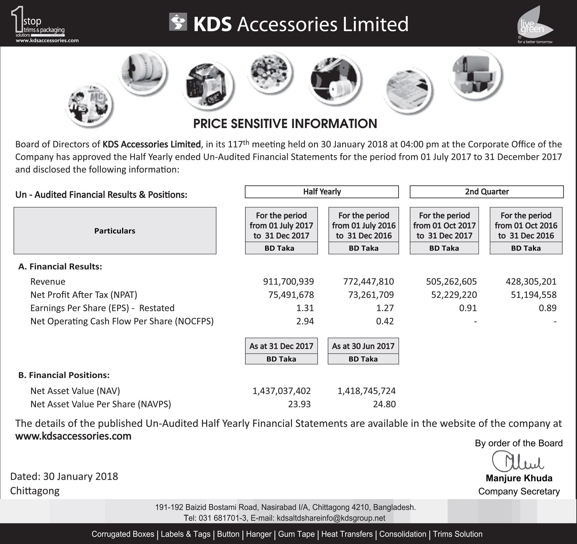 Half Yearly Financial Statements (Un-audited) of KDS Accessories Limited