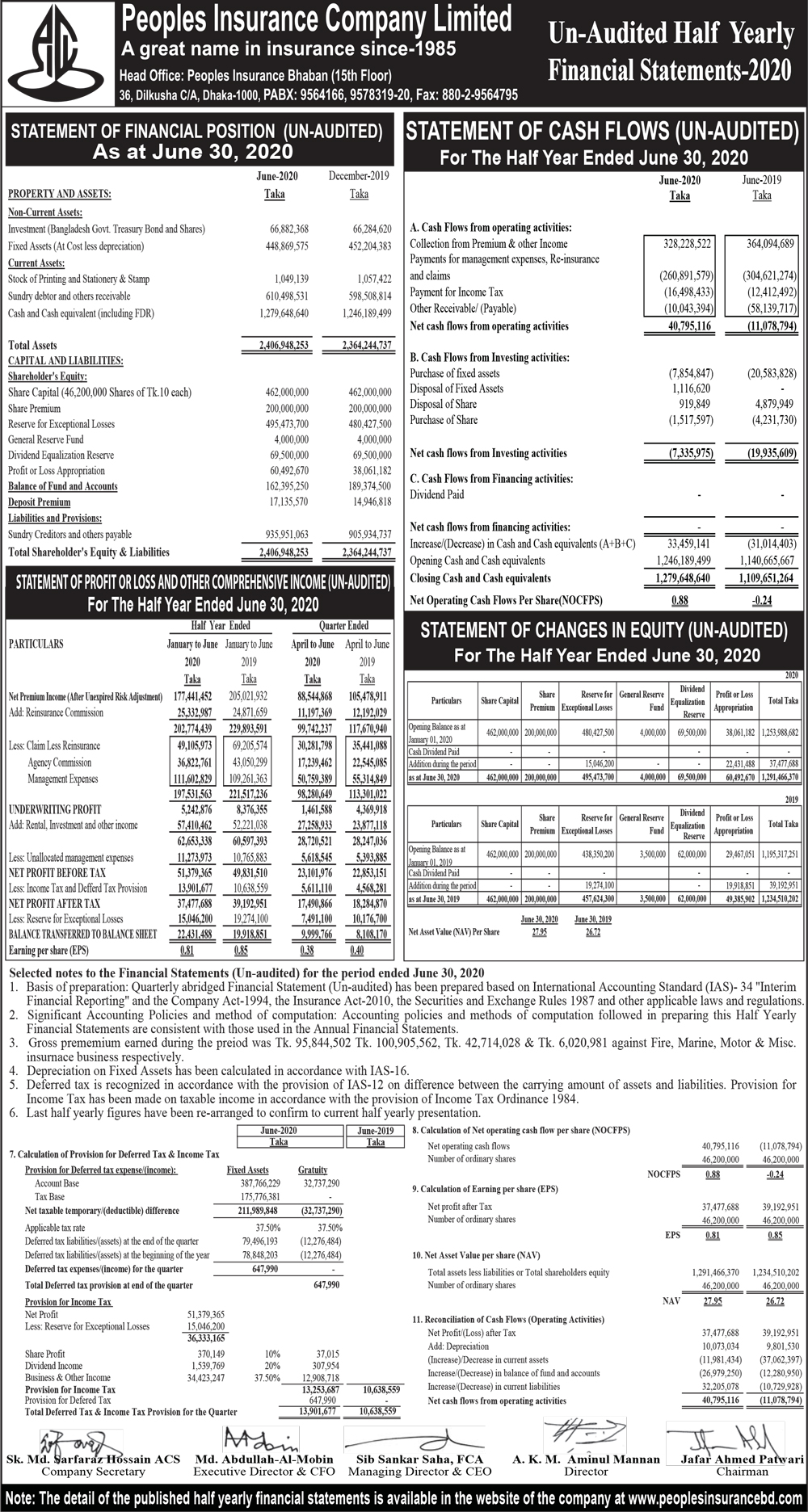 Half Yearly Financial Statements (Un-audited) of Peoples Insurance Company Limited