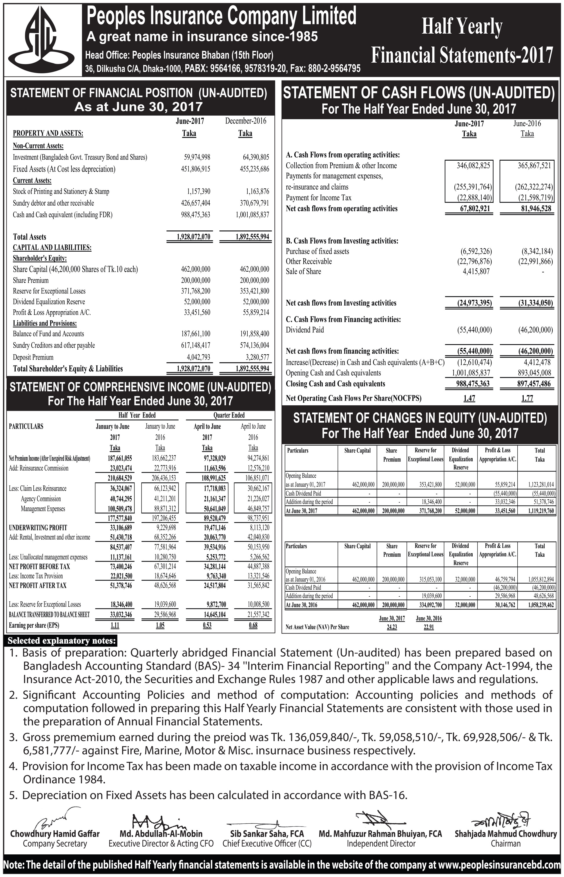 Half Yearly Financial Statements (Un-audited) of Peoples Insurance Company Limited