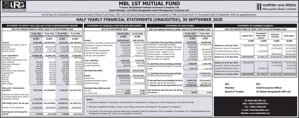 Half Yearly Financial Statements (Unaudited), 30 September 2020 Of MBL 1st Mutual Fund