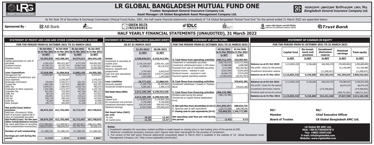 Half Yearly Financial Statements (Un-audited) of LR Global Bangladesh Mutual Fund One
