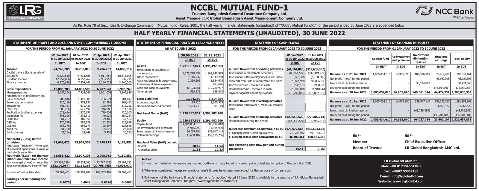 Half Yearly Financial Statements (Unaudited) of NCCBL Mutual Fund-1