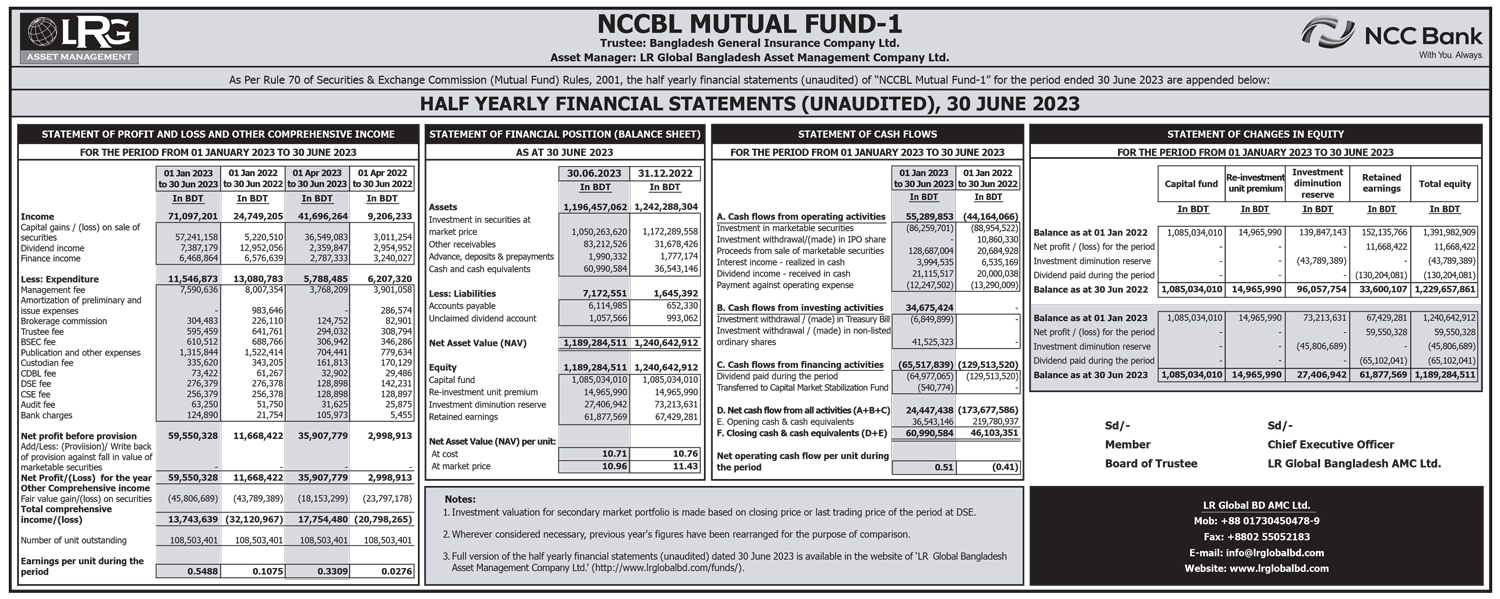 Half Yearly Financial Statements (Unaudited) of NCCBL Mutual Fund-1