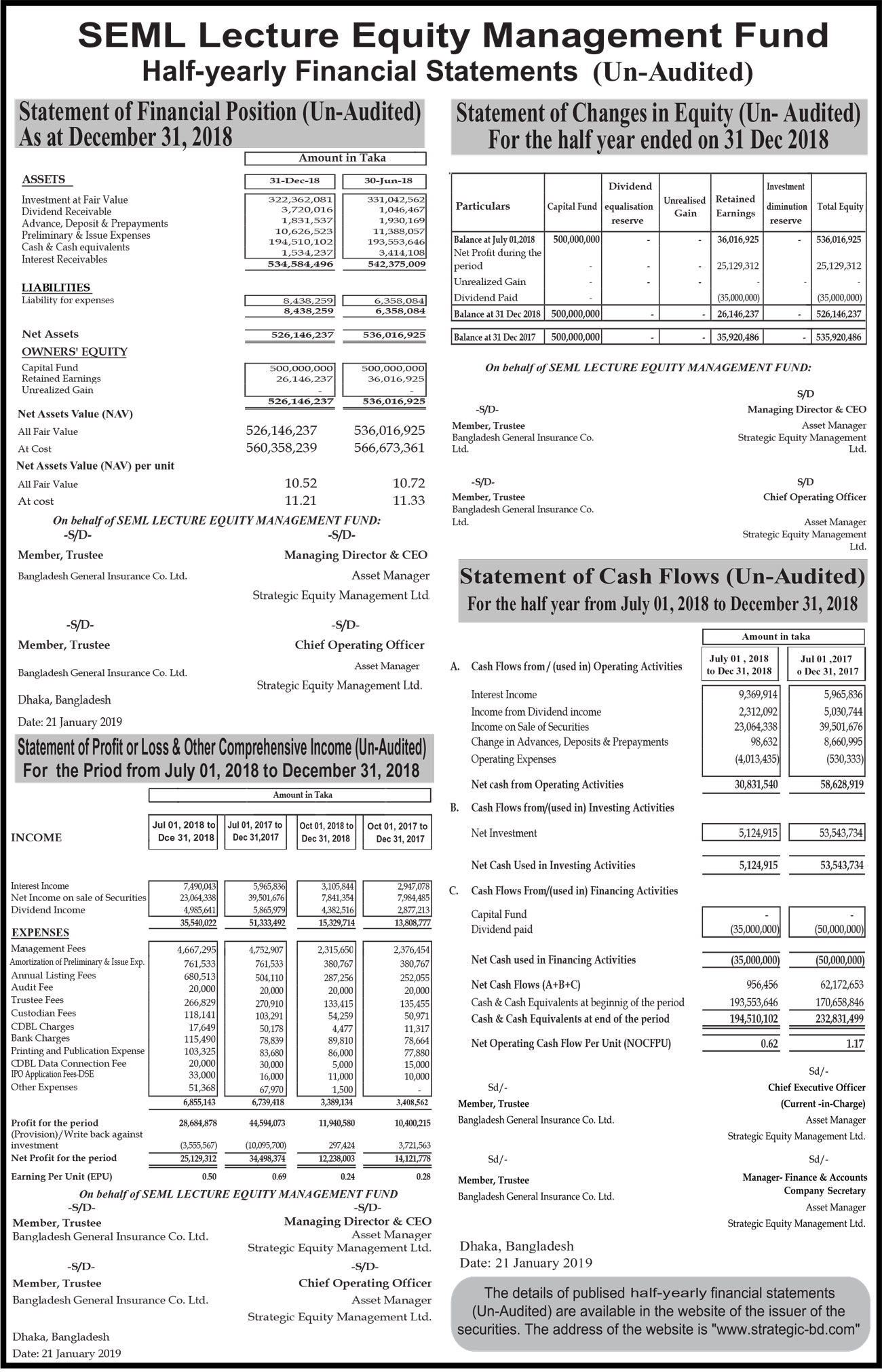 Half Yearly Financial Statements (Unaudited) of SEML Lecture Equity Management Fund