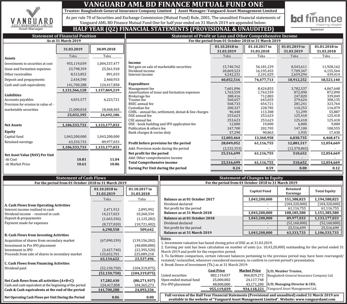 Half Yearly (Q2) Financial Statements of (Provisional & Unaudited) of Vanguard AML BD Finance Mutual Fund One