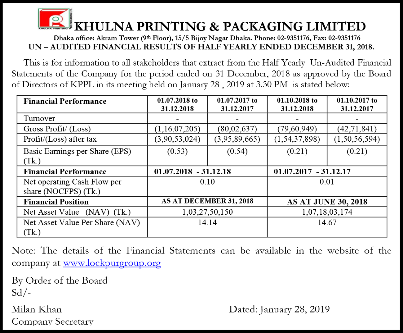 Half Yearly Un-Audited Financial Results of Khulna Printing & Packaging Limited